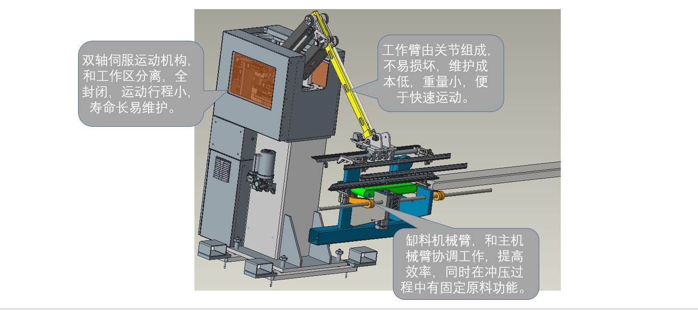 本光伏邊框生產線將機器人的智能化引入、融進該項加工工藝,為用戶生產需求量身定制。由送料傳輸、鋸切、C面沖孔、自動上角碼、內B面鉚點、長度、孔位檢測、包裝等工序組成。該光伏邊框生產線可以由傳統沖壓線及標準鋸切機及常用模具配合自動上料鋸切,下料機器人沖壓及自動上角碼,鉚點及下料等工序組成,結合了手工線的優勢,并采用機器人及智能傳料。并采用總線控制運動控制系統,滿足制造工藝的自動化控制要求,實現高效率、高精度,實現全自動化。為光伏邊框生產廠家所面臨的自動化程度低、產品質量不穩定、作業人員工作強度大等問題提供了智能自動化解決方案。
